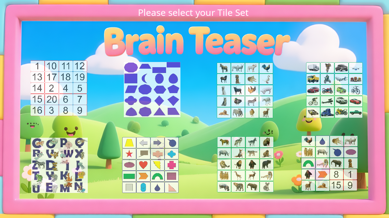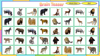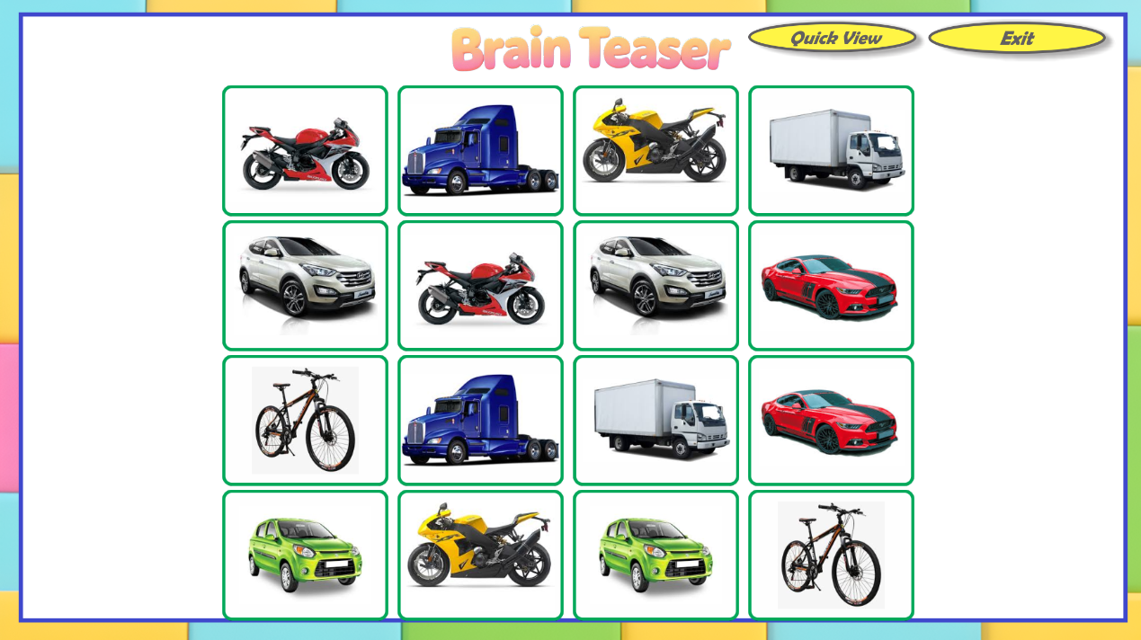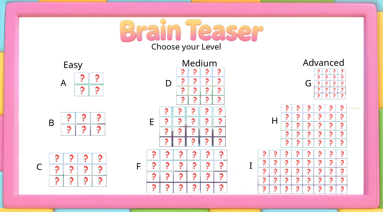Brain Teaser is an educational game, that displays a series of random images for a few seconds before they disappear. Players must memorize the locations of these images and then select matching pairs to win. This game helps improve memory, concentration, and visual recognition skills. By challenging children to remember and match images quickly, it enhances their cognitive development and sharpens their focus. Such activities also make learning fun and engaging, encouraging active participation and better retention of information.
