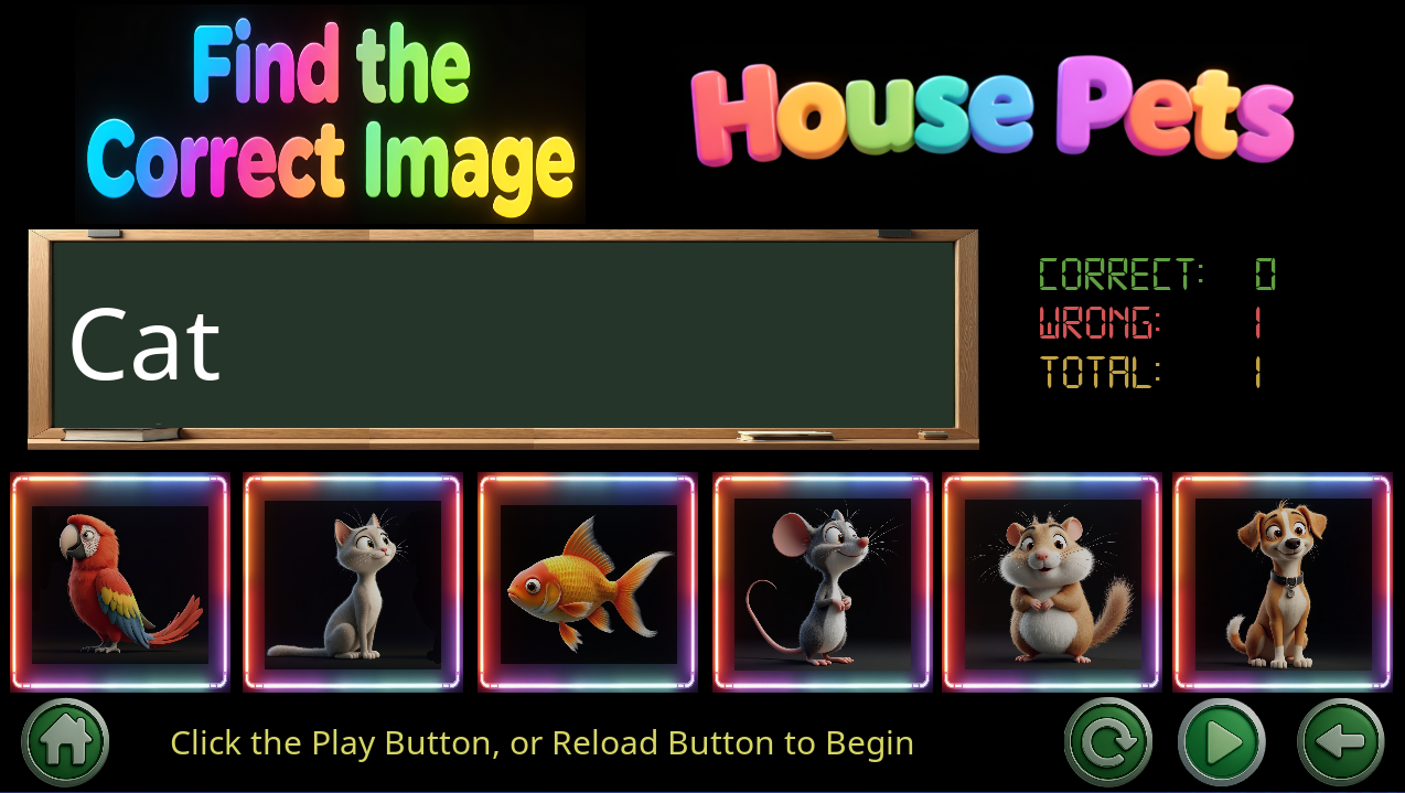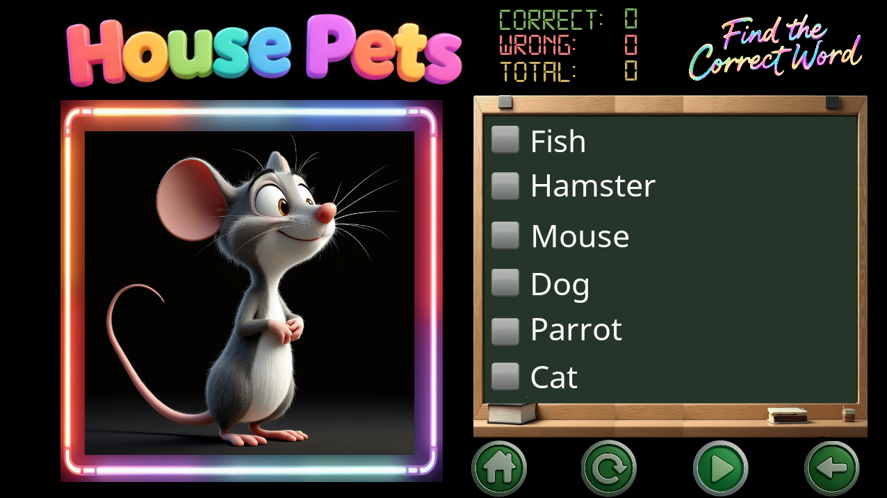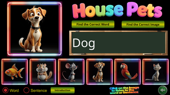 "House Pets Game" is an engaging game that allows players to learn about different household pets. In this game, players can explore various pet species such as dogs, cats, birds, rabbits, and many more. They can learn each pet's name, see photos. It's an educational and fun way for children to familiarize themselves with different animals commonly found in households.